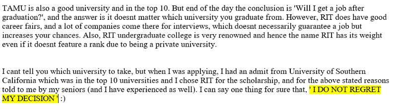 For checking the rankings, I used the following websites for evaluation: USNews, Startclass and Niche. As per the USNews website, the current rank of Texas A&M is 13 and Virginia Tech is 6 in the graduate course of Industrial Systems & Engineering. RIT is unranked in this field since the USNews ranks are based on the results of PHD pass-outs of the respective universities, and Rochester Institute of technology has just recently rolled out its first batch of PHD graduates. Thus, being unsure of the actual credibility of the rankings, I consulted multiple alumni and current grad students of the respective universities using LinkedIn, Facebook, Quora and Whatsapp groups.